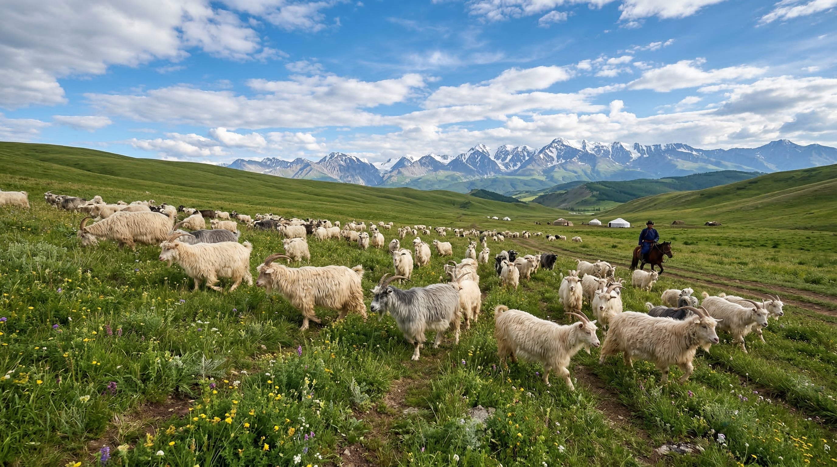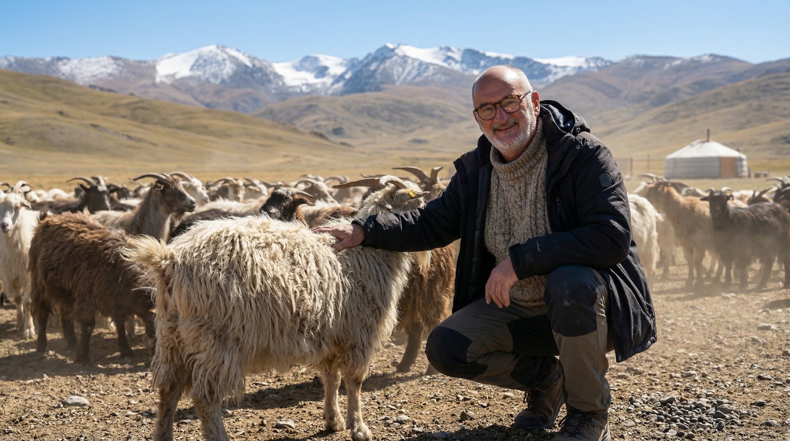 Notre cachemire provient de Mongolie intérieure où vivent les chèvres Capra Hisca qui produisent le cachemire. Les chèvres sont élevées dans leur milieu naturel dans des conditions climatiques idéales pour la production d'un poil de qualité. Leur toison est prélevée dans le plus grand respect des animaux deux fois par an avec un savoir faire séculaire.